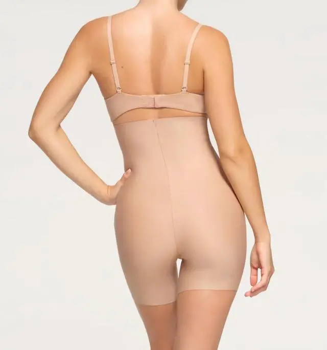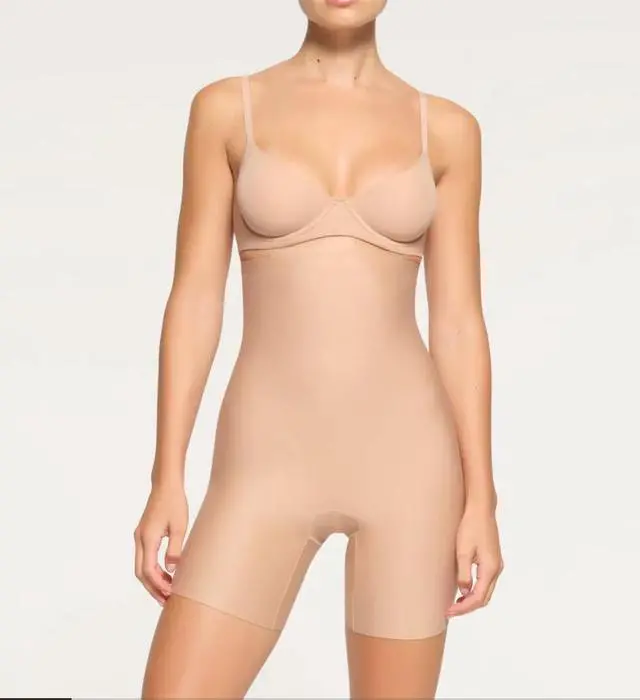 The Skims Body High Waisted Mid-Thigh Short in Clay, size Medium, is a solid-colored shapewear piece designed for women. Made of polyamide blended fabric, this high-waisted panty offers firm compression in the body area, with a wireless underwire type. Ideal for machine washable care, this opaque garment is a stylish and practical addition to any woman's wardrobe, providing a comfortable and flattering fit.