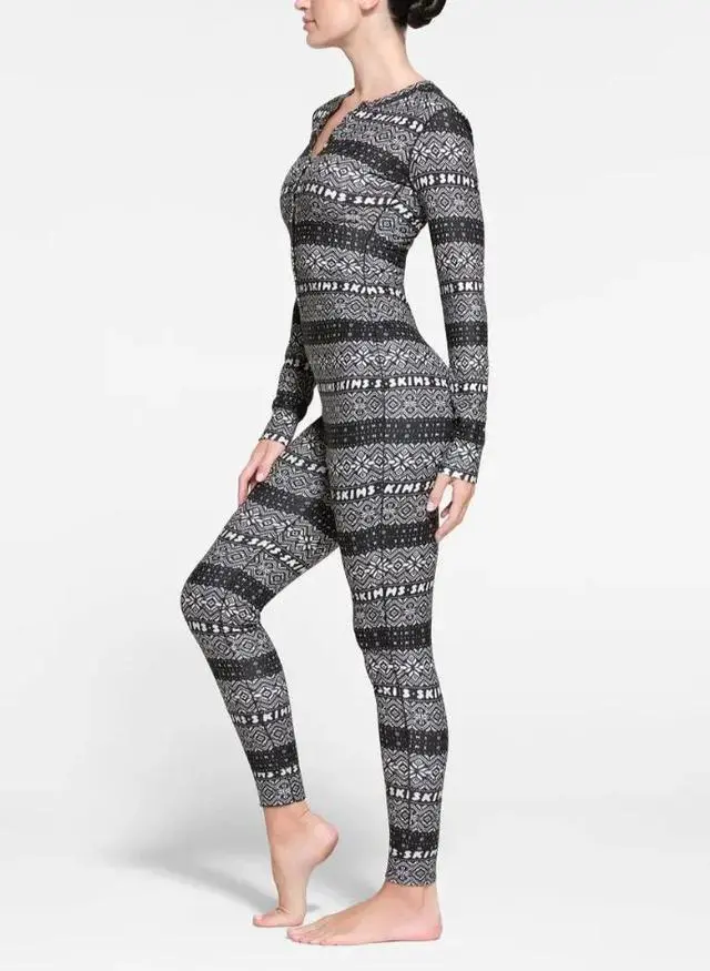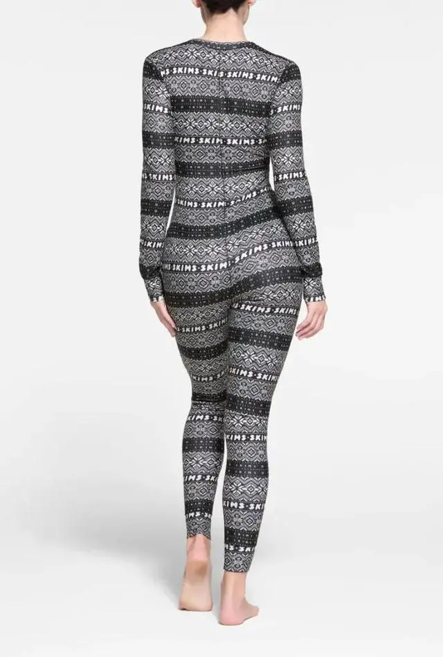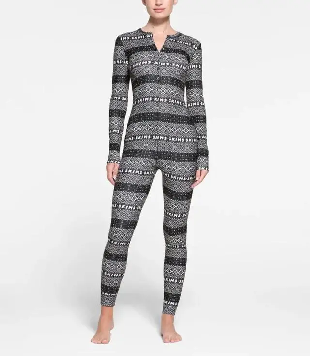 This Skims Logo Plush Pointelle Jumpsuit in Onyx Mirror Fairisle is a cozy and stylish addition to any woman's wardrobe. With its long sleeve, zip closure, and knit fabric, it is perfect for lounging around or sleeping. The Fair Isle pattern and logo accents add a touch of fun and flair to the classic black multi-color design. This jumpsuit is available in size 4X, making it a comfortable and fashionable choice for plus-size women.
