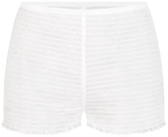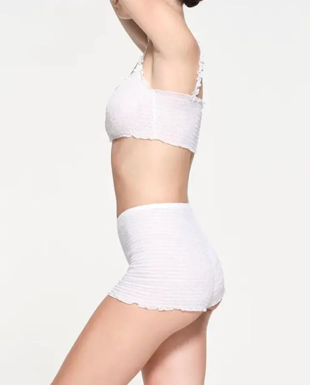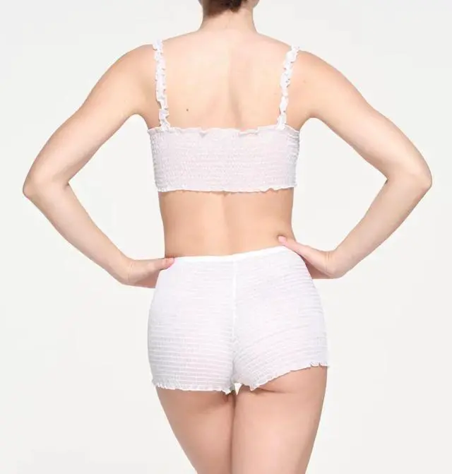 The Skims Romance Smocked Short in snow color is a stylish and comfortable boxer short designed for women in size 3X. Made by the popular brand Skims, this panty features a solid pattern with logo accents and a mid-rise fit. Machine washable and opaque, this underwear is perfect for everyday wear and adds a touch of romance to your intimates collection.