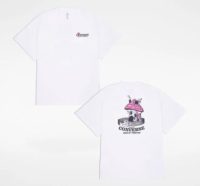 The Mushroom House Tee looks best when paired with textures that mimic its organic theme. Try styling it with corduroy trousers or earth-toned cargo shorts for a cohesive "outdoor-inspired" look. Complete the outfit with a pair of Chuck 70s in a neutral colorway like Parchment or Mossy Sloth.