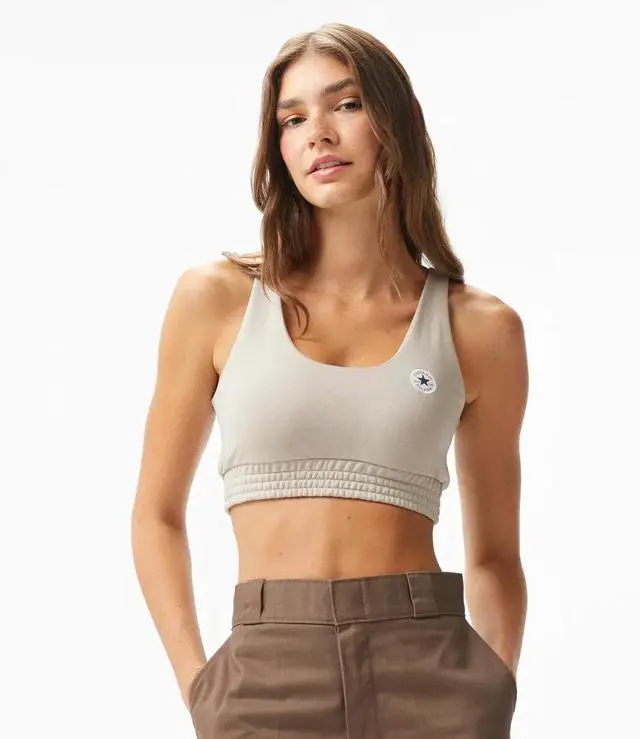 The Beige Chuck Taylor Sports Bra is a staple for the "clean girl" aesthetic. Pair it with high-waisted beige joggers for a monochromatic "set" look, or layer it under a sheer white Converse mesh tee. Complete the outfit with a pair of Platform Chuck Taylors to elevate the athletic silhouette.