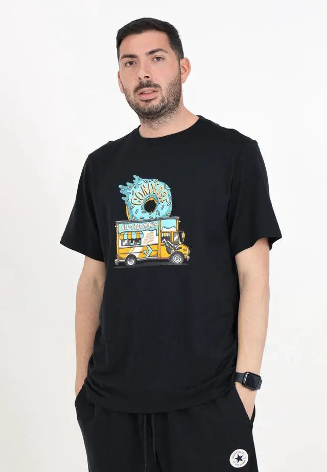 The Converse Men's All Star Donuts Truck T-Shirt in Black, size Medium, is a timeless and stylish addition to any wardrobe. Made from soft cotton material, this short sleeve shirt features a regular fit with a classic crew neck design. The shirt is machine washable for easy care and showcases the iconic Converse logo as a playful accent. Perfect for the summer, fall, and spring seasons, this T-shirt is a versatile and comfortable choice for casual wear.