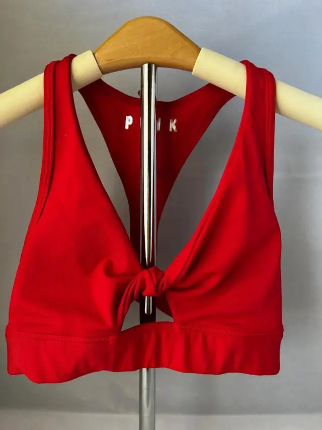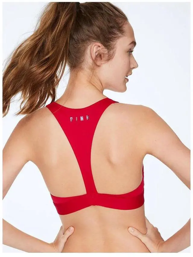 The Victoria's Secret Pink Sport Ultimate Lightly Lined Bra in red, size XS, is a stylish and functional activewear piece perfect for women who enjoy sports or other physical activities. This pullover bra features a solid pattern with the signature logo accents, making it a trendy choice for those looking for a comfortable yet supportive undergarment. Made from a blended polyester fabric, this wireless bra offers lightly lined cups and a full coverage design, ideal for active women who want a reliable and fashionable bra for their workout wardrobe.
