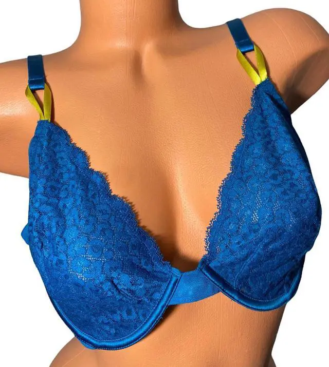The Victoria's Secret Unlined Demi Bra in size 36DDD is a stylish and comfortable underwired bra designed for women. Made from polyamide and lace fabric, this blue bra features a solid pattern with a hook & eye closure for easy wear. The unlined design adds a touch of elegance while the balconette style offers support and shaping. Perfect for everyday wear, this bra is a must-have in any lingerie collection.