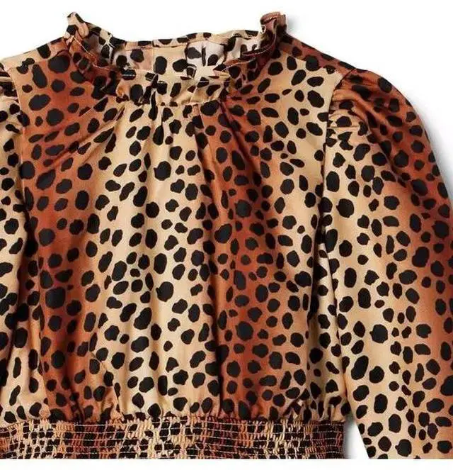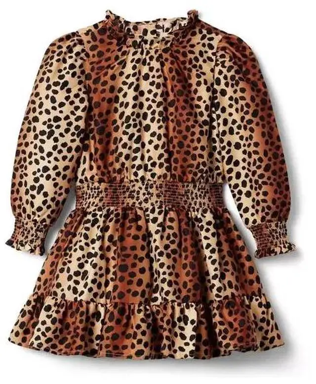 The Cleo Smocked Dress, Girls Size 14. Fall for this leopard print dress featuring stretch smocked details and a ruffled collar for spot-on style, every time.