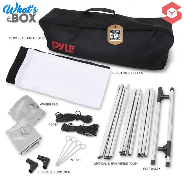 The Pyle 120" Portable Outdoor Projection Screen provides an HD 16:9 viewing experience with a wide-angle 160° viewing area, perfect for movie nights, presentations, or outdoor events. The screen features a matte white fabric for optimal color pickup and clarity. Its designed with a lightweight frame stand and triangular prism design for wind stability during outdoor use. The screen is foldable and washable, making it easy to store and transport in the included travel/storage bag. Whether for your home, office, or business, this screen provides an easy-to-assemble solution for high-quality projections in any setting.