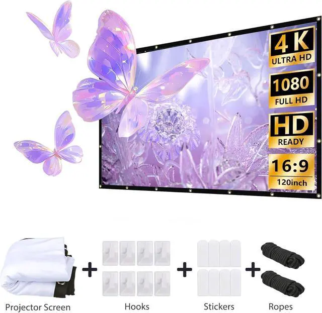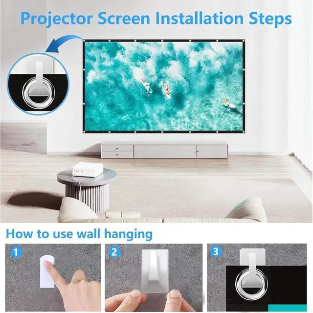 Portable and Easy InstallationThis home theater projector screen can be folded in small size and put it in your backpack or suitcase without any damage, and then take it to wherever you want with storage bag. Most important, this screen for projector coming with all the necessary tools(hooks,ropes and stickers), just need 5 minutes to set up, and the whole process was not complicated, can be done by yourself. PLEASE NOTE: The hook is only recommended to be attached to a smooth wall or tile but not use in Rough Wall , otherwise it will easily fall off
