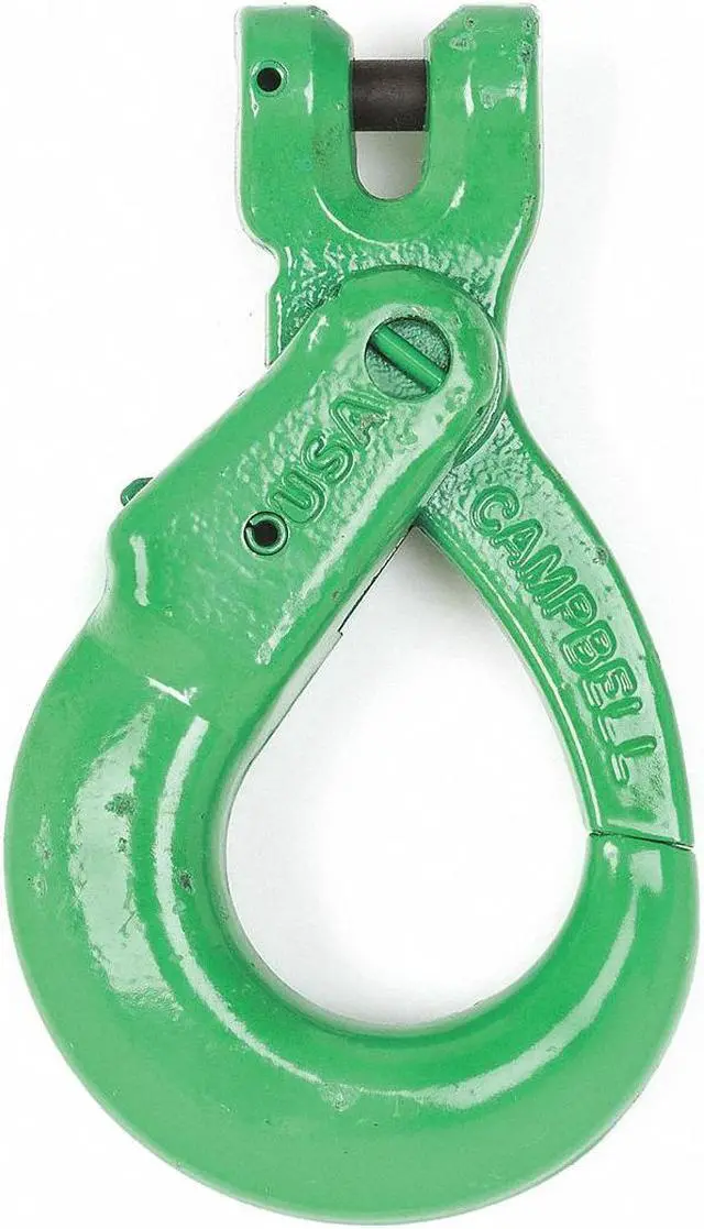 Self-Locking Hook, Material Alloy Steel, Grade 100, Hook Attachment Type Clevis, Trade Size 3/8 in, Working Load Limit 8, 800 lb, Hook Opening 1 7/8 in, Hook Reach Length 5 9/16 in, Clevis Pin Diameter 1/2 in, Clevis Inside Width 7/16 in, Green, Finish Powder Coated, For Use With Grade 80 or 100 Chain, Standards ASME B 30.9, ASTM A952, B 30.10. This item has been restricted from sale in the following state (s): []