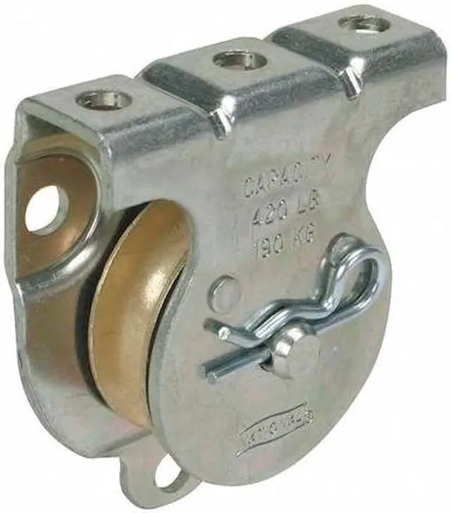 Pulley, Wall/Ceiling Mount, Eye Hook Inside Dia. 3/8 in, Max. Load Capacity 420 lb, Sheave Outside Dia. 1 1/2 in, Height 2 25/32 in, Width 2 15/64 in, Size 1 1/2 in. This item has been restricted from sale in the following state (s): []