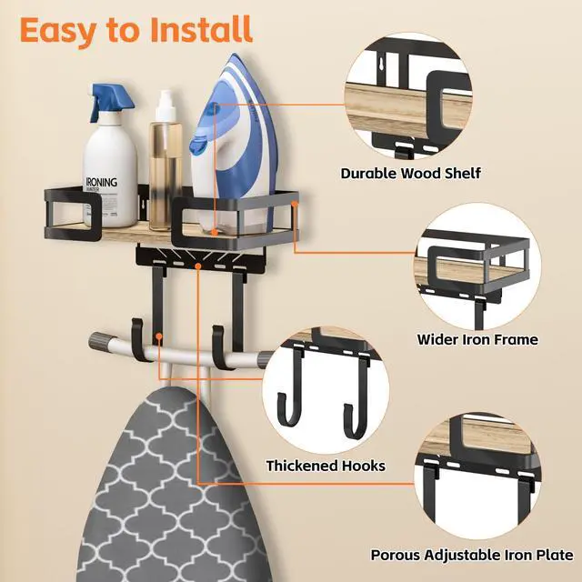 The iron-wood combination ironing board hanger comes with wall-mounting hardware for easy installation.