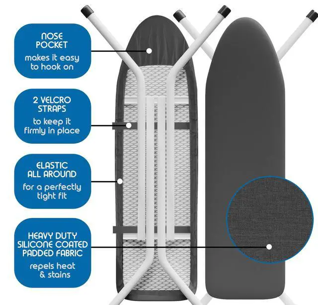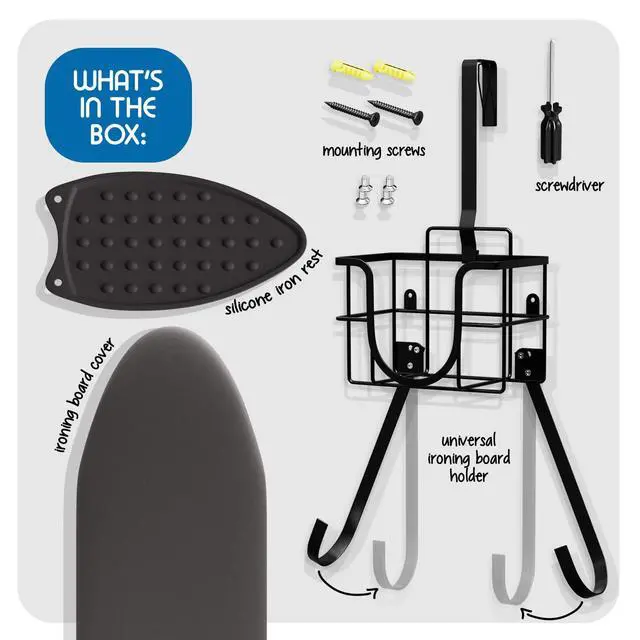 Modern in design and easy to install. Set includes a board hanger, ironing board cover pad, and an iron rest pad.