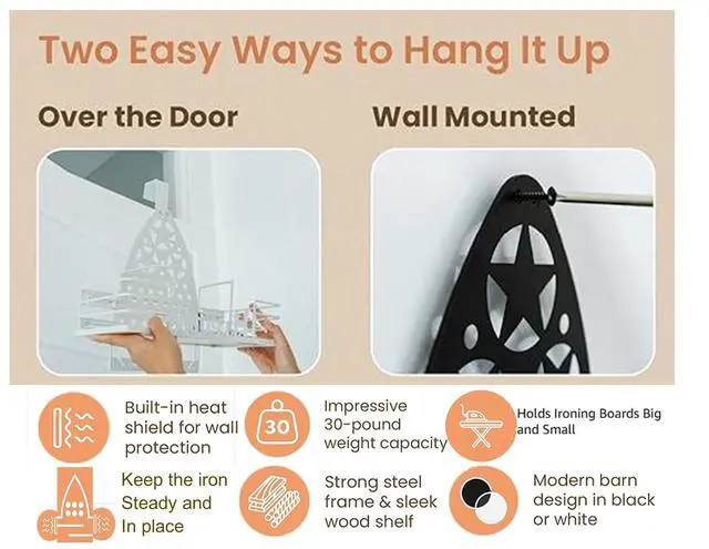We offer this aesthetic hanger in classic black or crisp white, each is made with a strong stainless steel frame and real wood accents for warmth and style. Safety is paramount in our design, which is why we've incorporated a heat shield. It protects your walls from the high temps of your iron, preventing any potential damage or discoloration.