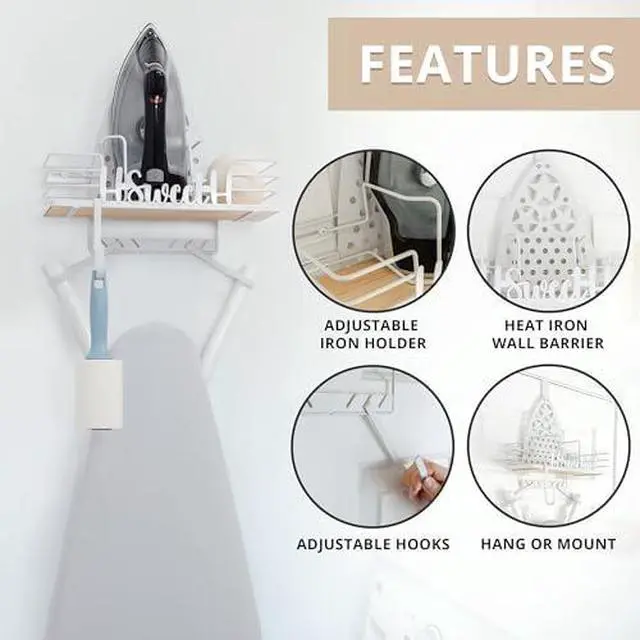 • Built to Hold Most Boards & Irons: Our iron board holder measures 14" L x 6" D x 18" H and comes with adjustable hooks, so it can hold compact apartment models to full-sized family boards; And don't worry about your iron - there's a special spot for it too