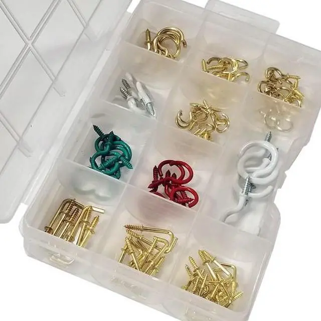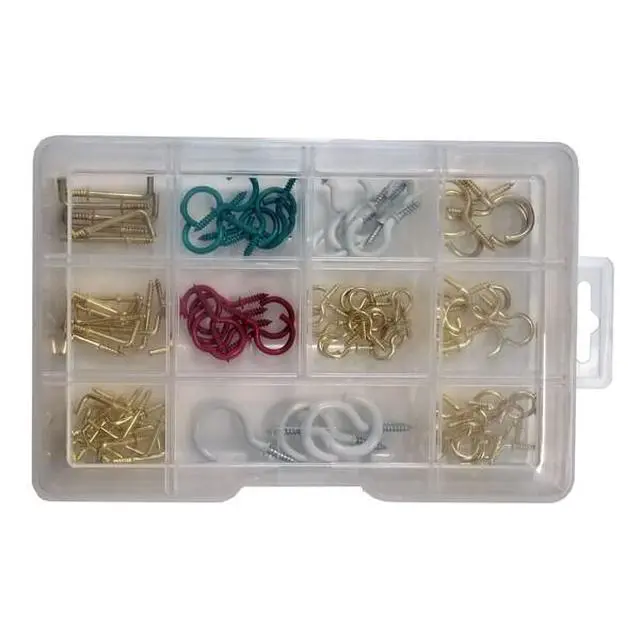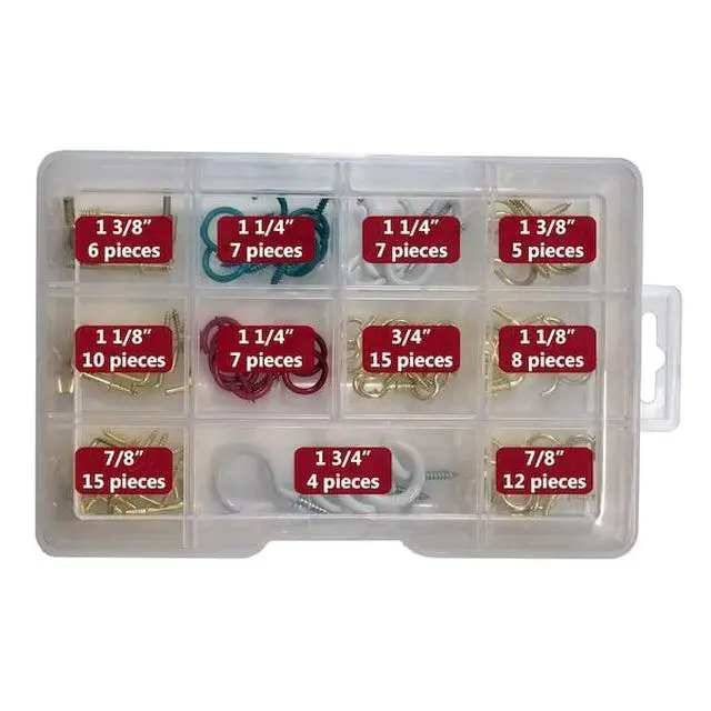 Cup Hooks 15 pieces of 1/2, 12 pieces of 5/8, 8 pieces of 3/4, 7 pieces of 7/8, 5 pieces of 1 7/8, 4 pieces of 1 1/4. Square Hooks 15 pieces of 5/8, 10 pieces of 3/4, 6 pieces of 1. Easy to Install by Hand Sharp screw points make it easy to install cup hooks in any position with just some force. Wall Hooks Weatherproof ceiling hooks are perfect for outdoor use or indoor use. Use Them to Hang cups, planters, feeders or other light goods from the bottom of shelves, in walls, or other wood structures.