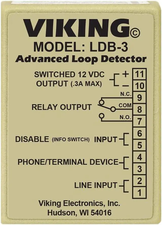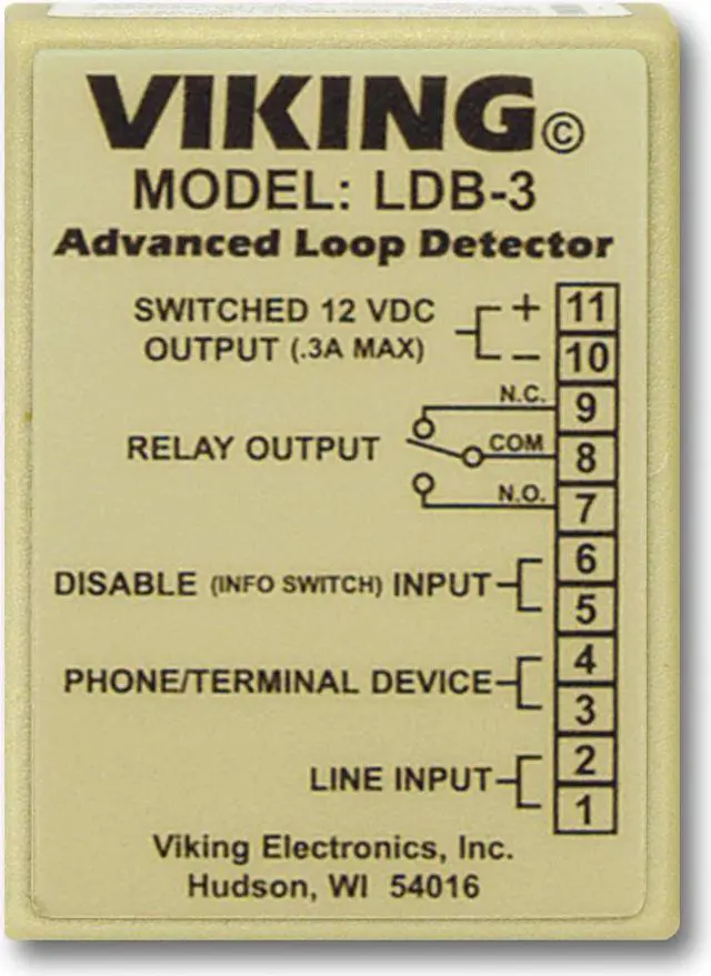 - Viking Advanced Loop Detector loop detect board for ring and line in use contact closures- Provide a contact closure during ringing and/or off-hook- Monitors an analog phone line for ringing or an off hook condition- A built-in relay can be activated when either of these conditions are detected- This is ideal for monitoring line status or for providing a visual indication of such- Disable input is ideal for two-button emergency phones, such as Viking's E-1600-20A, allowing Info button calls to be placed without activating the relay (turning on the emergency strobe light, camera, etc.