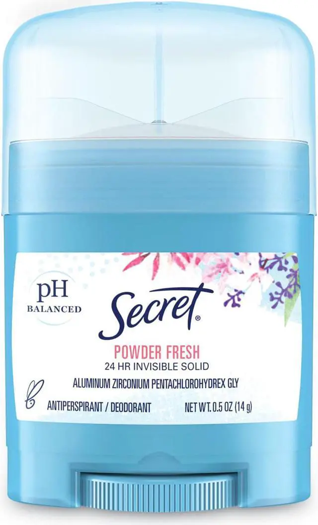 Keep your secrets with a strong, solid deodorant that provides invisible protection, gliding on clear. pH balanced deodorant. Works with the bodys natural chemistry for thorough, comfortable protection against wetness and odor. Strong enough for a Woman. Personal Care Product Type: Antiperspirant/Deodorant; Scent: Powder Fresh; Volume Capacity: 0.5 oz; Active Ingredient: Aluminum Zirconium Trichlorohydrex GLY.