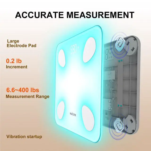 High Accurate Measurement: Equipped with 4 high-precision sensors, the smart body fat scale delivers accurate readings in 0.2 lb / 0.1 kg increments and supports up to 400 lbs / 180 kg.