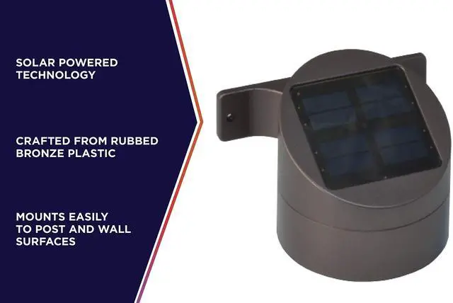 The Moonrays 91851 Solar Powered LED Wall Mount Deck Sconce Light is designed to illuminate your outdoor walkways, dining areas and decks, all while adding extra security to your home and taking advantage of solar energy. Made of durable plastic, this bronze light mounts easily to posts and walls and provides a white light, emitting 18-lumen LED. This light is 15x brighter than traditional 1.2-lumen solar lights and the .35-watt LED provides a 120-degree angle beam to increase your area of light. The LED bulb will never need to be replaced and will remain cool to the touch at all times, providing safe lighting that will not burn or heat-up. With no wiring required, installation, long-term energy savings and becoming eco-friendly has never been easier! Moonrays solar lights gather energy from the sun during the day, then automatically come on at dusk to provide a pattern of light exactly where you want it. The (2) rechargeable batteries (included) charges using the sun's rays and advanced Moonrays solar technology to provide light for 6 to 8-hours on a full battery charge. The Moonrays 91851 Sconce Light has a 5.5-inch height, 4.9-inch width, 6.4-inch length and designed to provide additional safety and security while enhancing the beauty of your residence. Let Moonrays help make your outdoor settings as livable, enjoyable and charming as any room in your home. The Moonrays 91851 Solar Powered LED Wall Mount Deck Sconce Light comes with a 1-year limited warranty, provided to the original purchaser, which protects this product from manufacturing defects in material, assembly and workmanship. Coleman Cable, Inc. is a leading manufacturer and innovator of electrical and electronic wire and cable products for the security, sound, telecommunications, electrical construction, retail, commercial, industrial, irrigation, HVAC and automotive markets. Coleman Cable, Inc. offers a family of leading brands such as Designers Edge, Yellow Jacket, Woods and Moonrays.