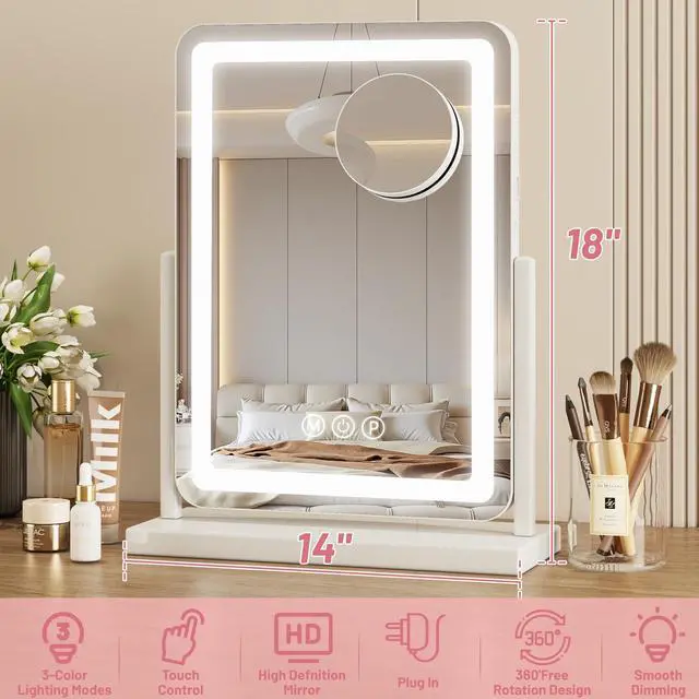 Suidia Vanity Mirror with Lights, 18"×14" LED Makeup Mirror with Light, Smart Touch with 3-Color Lighting, 360°Ratation for Vanity Desk Tabletop,White,Lamp Belt Style