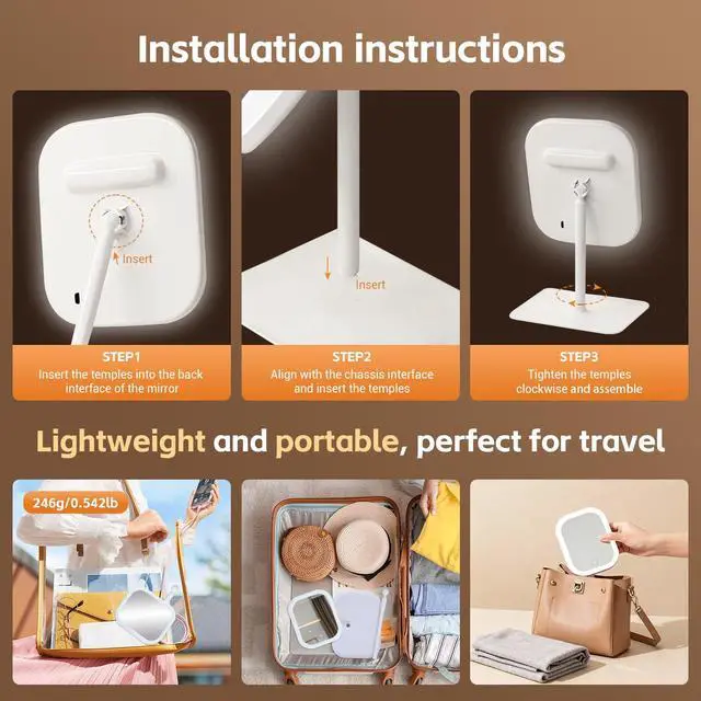 Transform your daily beauty routine with this sophisticated LED makeup mirror, featuring cutting-edge technology and versatile functionality. The sleek, modern design includes a 270-degree rotation capability, allowing you to achieve the perfect viewing angle. With three distinct lighting modes - Cool for office settings, Natural for outdoor lighting simulation, and Warm for evening environments - you can perfect your look under any conditions. The mirror's dimmable brightness settings let you customize the illumination to your exact needs. Powered by a robust 2400mAh rechargeable battery, this portable vanity mirror ensures you're never left in the dark. The thoughtfully designed base provides stability while maintaining a minimalist aesthetic. Touch controls offer intuitive operation, while the compact size makes it perfect for both your vanity and travel needs. The clean white finish complements any decor, making it both a functional tool and an elegant addition to your space.