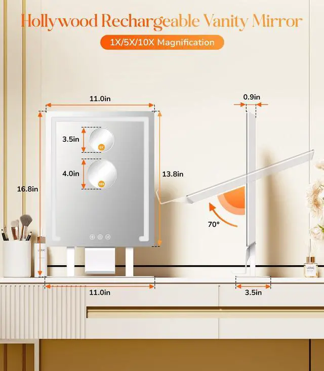 Gospire Lighted Makeup Mirror, Hollywood Rechargeable Vanity Mirror with Detachable 5X/10X Magnification Mirror, 3-Colored Dimmable Lighting & Touch Control, 11x16.8 LED Tabletop Mirror for Bedroom