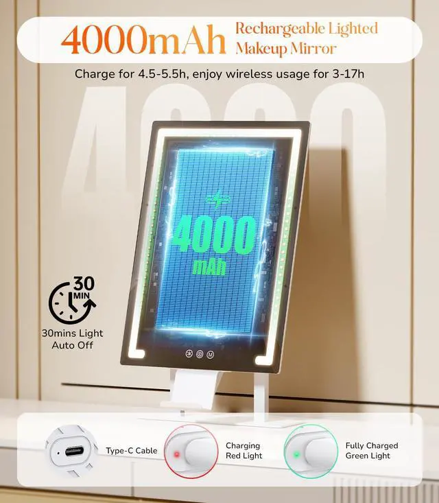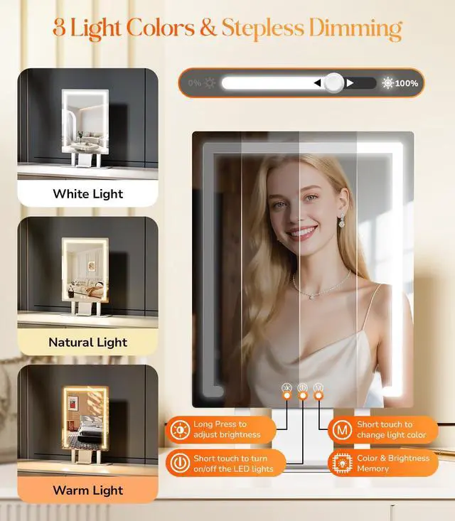 - CRI 95+ & 3 Light Colors & Stepless Dimming: With an ultra-high CRI 95+ rating and built-in 96 LED lights, this tabletop makeup mirror with lights offers white, warm, and natural light modes, coupled with stepless brightness adjustment, allowing you to easily adjust brightness, giving you a great viewing while applying makeup in dark or poorly lit areas, perfectly meet the different occasions makeup needs