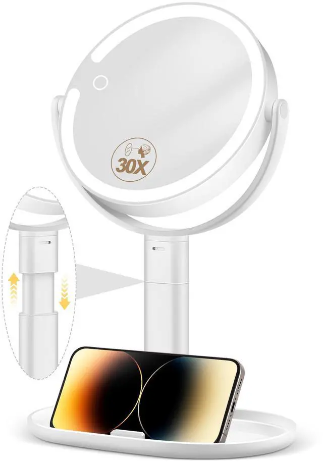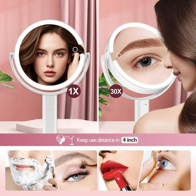 30X side: precision tasks—shaping brows, drawing eyeliner, applying false lashes, inserting contacts, targeting fine skincare details (e.g., blackhead removal). Ideal for myopia or poor eyesight; high magnification + bright light ease delicate work.