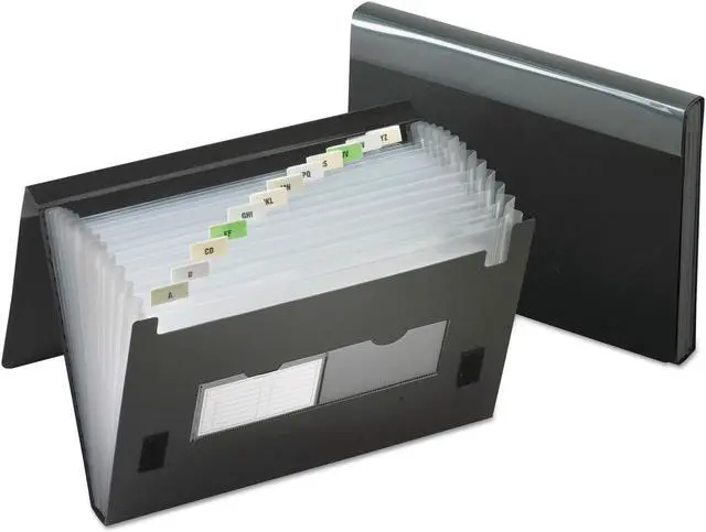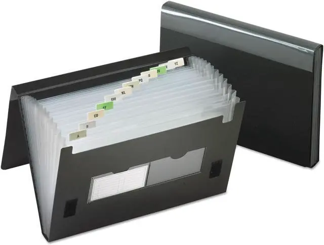 Pendaflex Company expanding file has 12 built-in tab dividers, A-Z and blank inserts, two interior window pockets and is constructed with textured-polypropylene material.