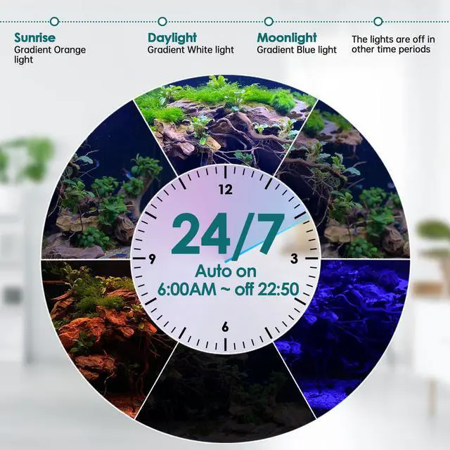 - 24/7 Natural Light Cycle: Automatically mimics nature with sunrise (orange, 6-8 AM), daylight (white, 8 AM-6 PM), and moonlight (blue, 6-10:50 PM) for stunning viewing