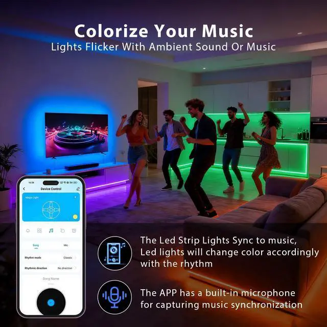 Music Sync: The color of LED strip lights will sync with the beat of music or sound in real-time, creating a romantic, relaxing, magical, gorgeous, and interesting atmosphere for you, light up your life and makes life more colorful and wonderful