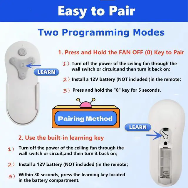 KUJCE10311/ KUJCE10712 Universal Ceiling Fan Remote Control Kit for Harbor Breeze Hampton Bay, 3-Speed Light Dimmer, Replacement TR214A, TR214B, 2BB78-ITL-F304C, A25-FA0138, KUJCE10610, 2AQZU-18018 This KUJCE10311/ KUJCE10712 fan remote control kit works most 110V 3-speed AC ceiling fans, compatible with Harbor Breeze, Honeywell ,Hampton Bay, Hunter ,Allen+Roth, Litex, Kichler , Westinghouse ,Home Decorators Collection and other ceiling fans, suitable for most downrod style fans, not recommended for use with hugger style fans. This wireless remote controller kit suitable for replacement or converts traditional ceiling fan light into a remote controllable one. This universal celiling fan remote control kit is compatible with Harbor Breeze Fan remote Model: KUJCE10311/TR214A , KUJCE10712/TR214B, 2BB78-ITL-F304C, A25-FA0138, KUJCE10610, 2AQZU-18018/TR214D, A25-TX00I, A25-TX001-R1, A25-TX005RKUJCE9603, CHQ7202T, CHQ7202T1, L3HFAN35T, 2AAZPFAN35TI, FAN-53T Works with the Harbor Breeze Beach Creek/ Mazon ceiling fan remote for models TG44XXX3D1RC, TG44XXX3D1RS, TG52XXX3D1RC, TG52LW3D1RCS, BRD48XXX6LR, BRD60XXX6LR, CAF48XXX5L, E-CAF56OSB5CRC, CHA52MBK5LR, FW60XXX3LR, FWH60BNK3LRS, RS54xxx6LR, WE52XXX5LR and MZ44XXX3LR. For item 1145471, 923049, 803772, 1145471, 883810, 1145470, 1117023, 883809, 2599780, 4143804, 1117039, 4057329, 1596999, 1117034, 4057327, 1117035, 1117038, 1117022, 649729, 4057326, 1145466, 1145467, 883804, 1596996, 1117028, 1117027, 1158926, 1117018, 807422, 1059534, 2599776, 807421 The ceiling fan receiver does not need to set the code to match, just point the remote control at the receiver and click Learn button to match.The fan remote control kit can be mounted on a pull chain switch or wall switch ceiling fan. Before using this wireless controller, please remember to use your original switch to turn on the lights and fan to maximum speed. Please follow the Instruction of Installation to intsall it. Set the DIP switches combination of the remote/transmitter and receiver at the same pattern, install the FAN28R receiver(4.65*2.09*1.18 inches) to your ceiling fan canopy, put the battery inside the remote, and it's ready to work. Includes Fan Remote Control *1, Ceiling Fan Receiver *1, Wall Mount Holder *1, User Manual *1, Wire Nuts *6, Screws *2. This remote use a '23A 12V' battery (NOT INCLUDE) for power supply.