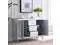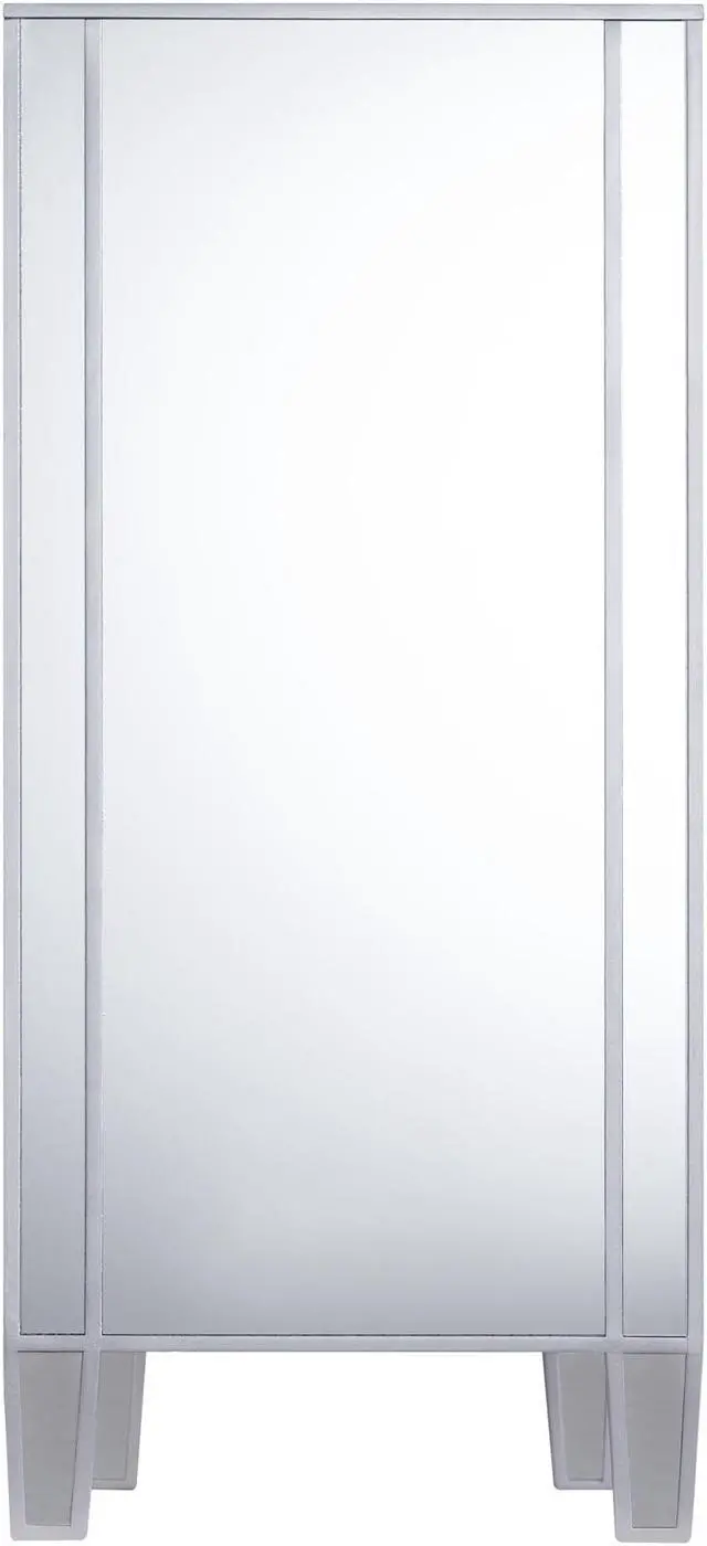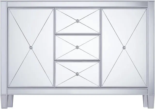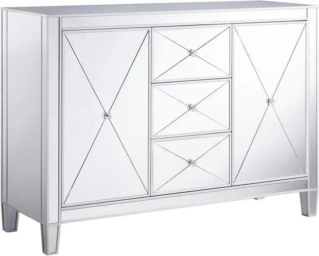 Reflect your glamorous side. Bathed in glistening silver from head to toe, this storage cabinet contains three stacked drawers and two spacious cabinets for a maximum amount of concealed organization. Chic details, such as crystal knobs, scored mirrors, and matte silver trim evoke Hollywood regency opulence. Add this elegant chest to your dining or living room and let your style stand out.