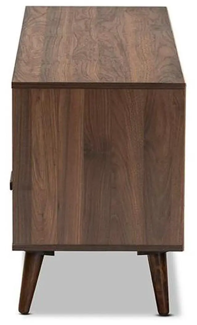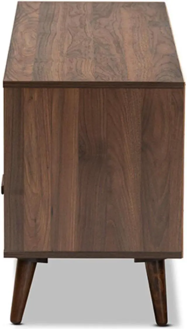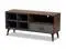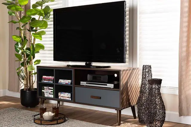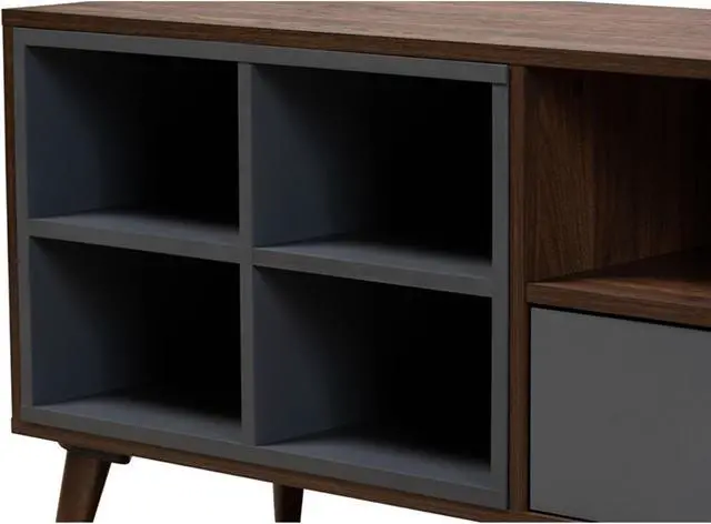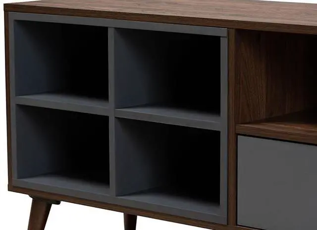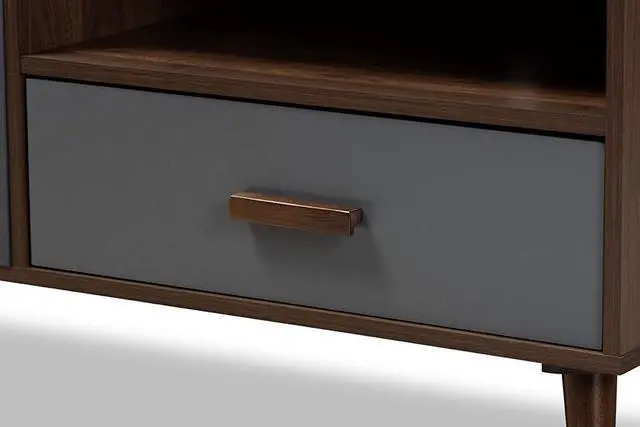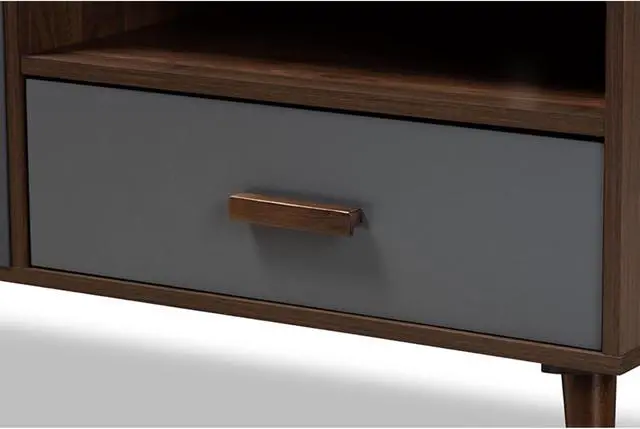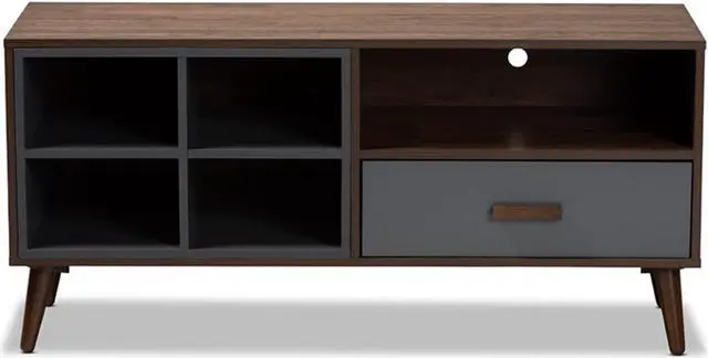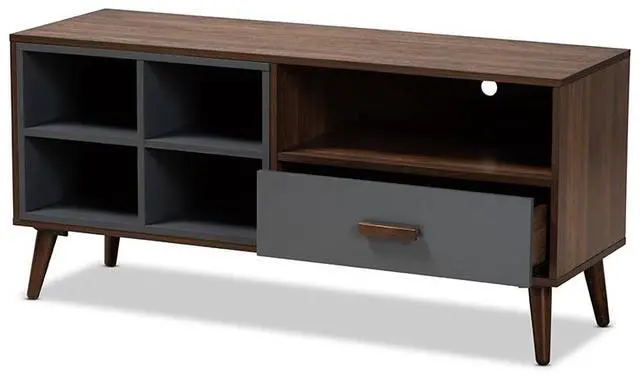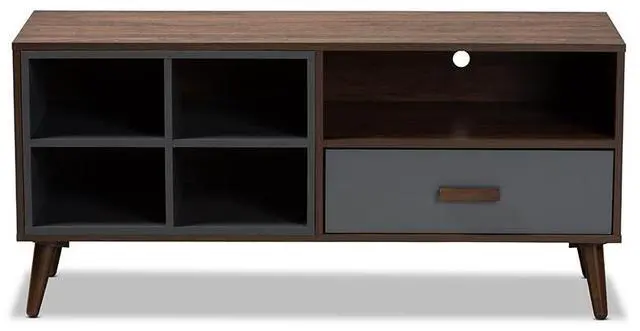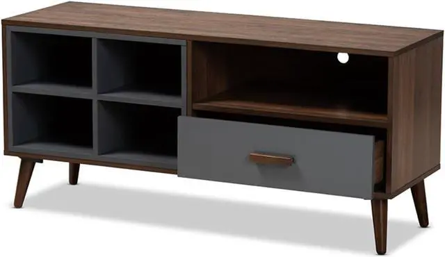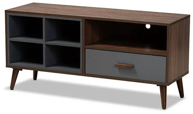 With sleek contemporary design influence, the Garrick TV stand adds storage and style to any space. Made in Malaysia, this TV stand is constructed from sturdy wood showcasing a two-tone finish of grey and walnut brown. The Garrick is equipped with five open shelves, as well as one large drawer, to easily organize all your media devices. Requiring assembly, the TV stand is also fitted with a cord management hole for easy setup. Angled legs provide excellent stability, making the Garrick TV stand a fantastic addition to the modern home.