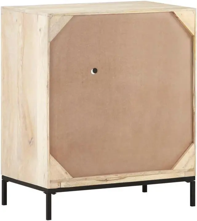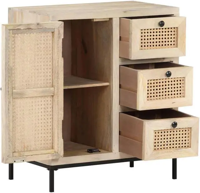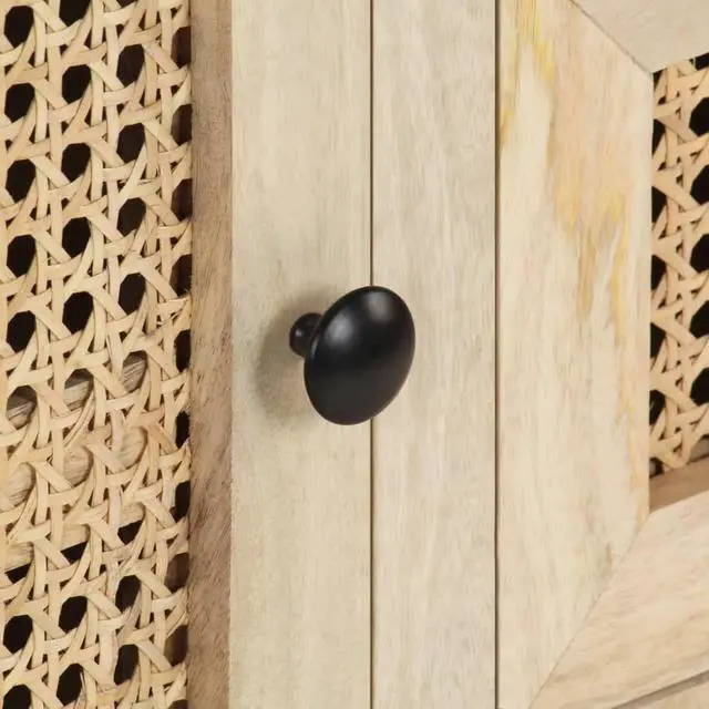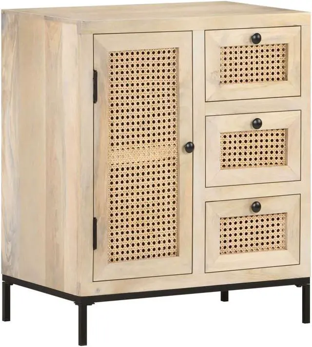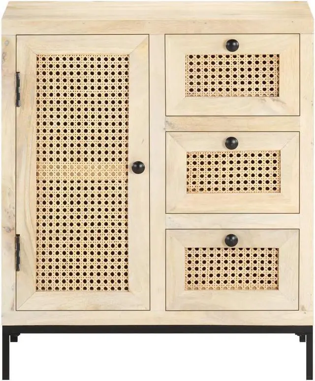 Solid mango wood is a tropical hardwood. It on the one hand has the strength to bear the weight, and on the other hand stands the wear and tear of time. Additionally, the exquisite craftsmanship and beautiful wood grains make every piece of side cabinets slightly different from the next. The wooden cabinet is equipped with ample storage room, so you can display or keep any items you'd like well organized. The steel base contributes to its sturdiness and stability. What's more, the storage cabinet features hand-woven cane patterns on the door and drawers, adding to its rustic charming.