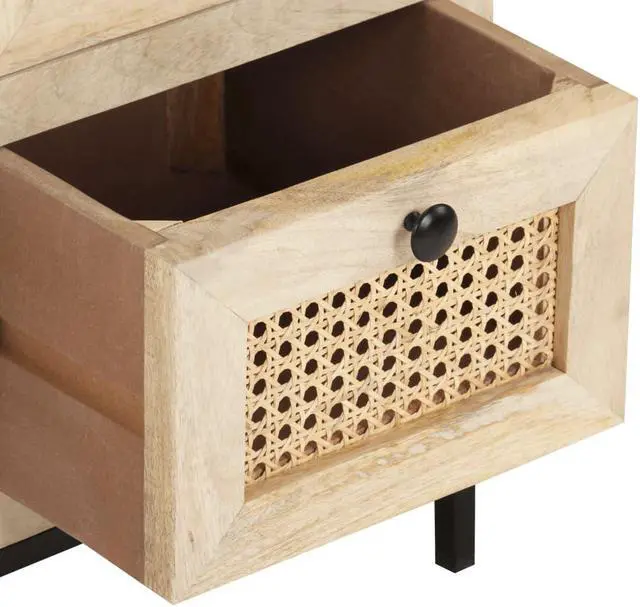 - Material: Solid mango wood with a bleach finish, natural cane, powder-coated steel