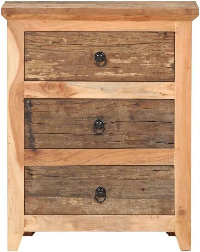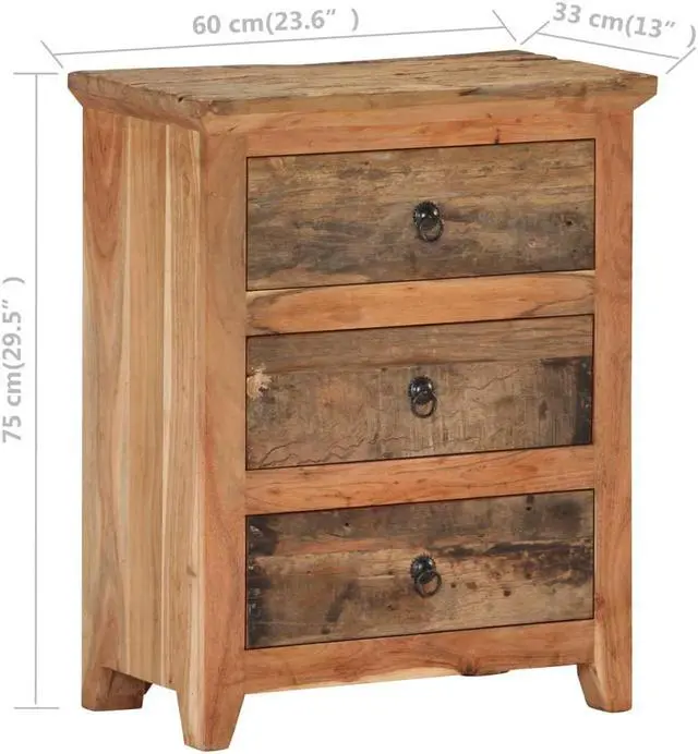 This drawer cabinet is made of solid acacia wood and solid reclaimed wood. Reclaimed wood is sourced from joists, floors and support beams from old demolished buildings. So, it consists of different types of wood like pine, teak, oak, mango wood, acacia, etc. This also means the reclaimed wood retains the characteristics of these types of wood. Reclaimed wood is already aged, weathered and dried, so it doesn't shrink or bend. The side cabinet is equipped with 3 drawers, providing ample storage room for keeping any items you'd like well organized.