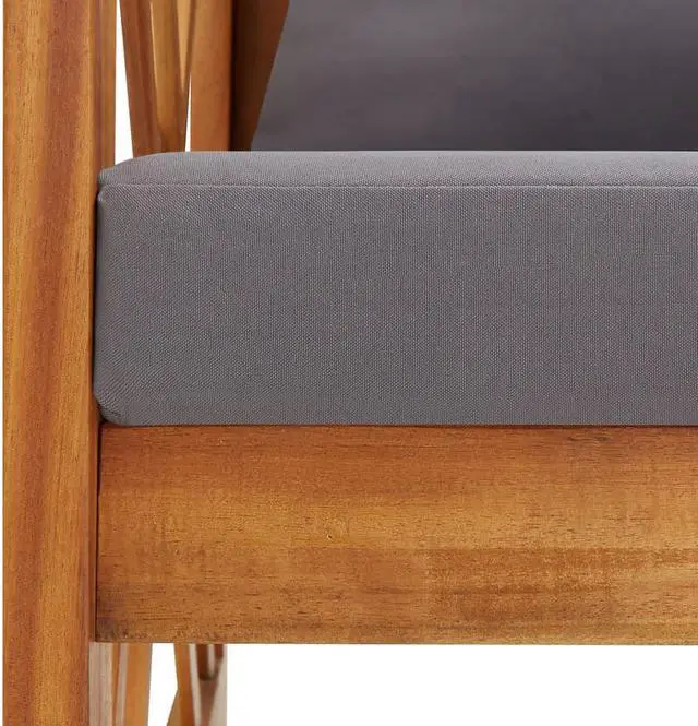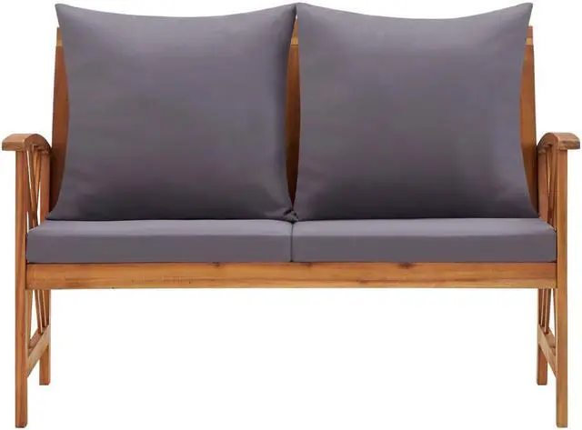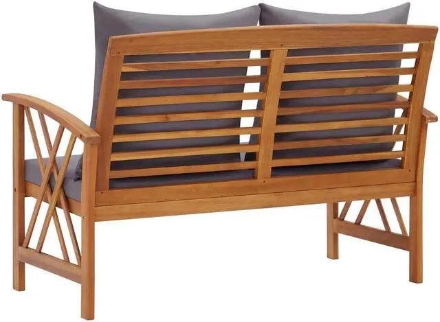 This simplistic patio bench with cushions is perfect for you to enjoy the fine weather and relax in your garden or patio. This outdoor bench is made of solid acacia wood, a hardwood with dense grains. The beautifully-designed bench is stable, durable and eye-catching. The oil-finished surface is easy to clean with a damp cloth, and suitable for outdoor use. The included seat cushions and back pillows provide optimal seating comfort. The wooden bench makes it an ideal place for relaxing, chatting with your family members in your garden, patio or balcony.