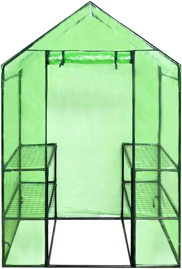 This greenhouse is perfect for growing plants and protecting them from bad weather. The greenhouse comes with a sturdy, powder-coated steel frame and a tear-resistant cover. The cover is made of durable UV-proof, frost-resistant material. So you will no longer have to worry about damage caused by sunlight or the cold. The transparent green cover also allows the sunlight to reach the plants. It has 2 shelves on each side, which gives the greenhouse a large storage space. You can store flowerpots under the shelves. The zippered roll-up door makes it easy to go in or out.