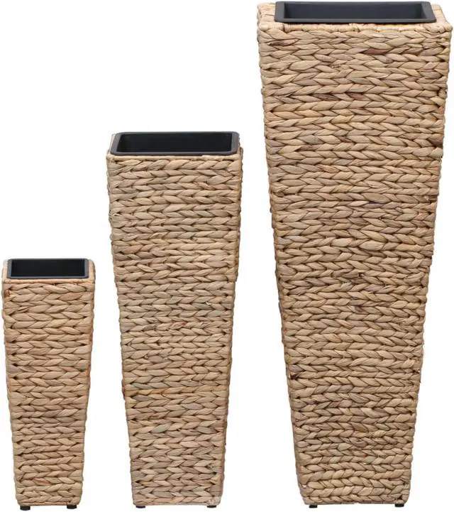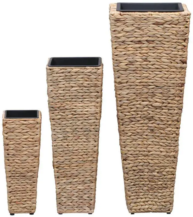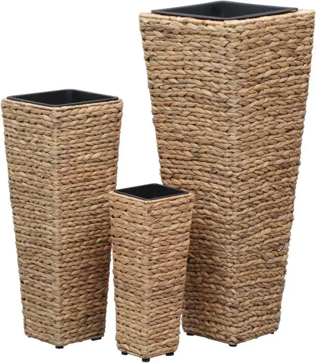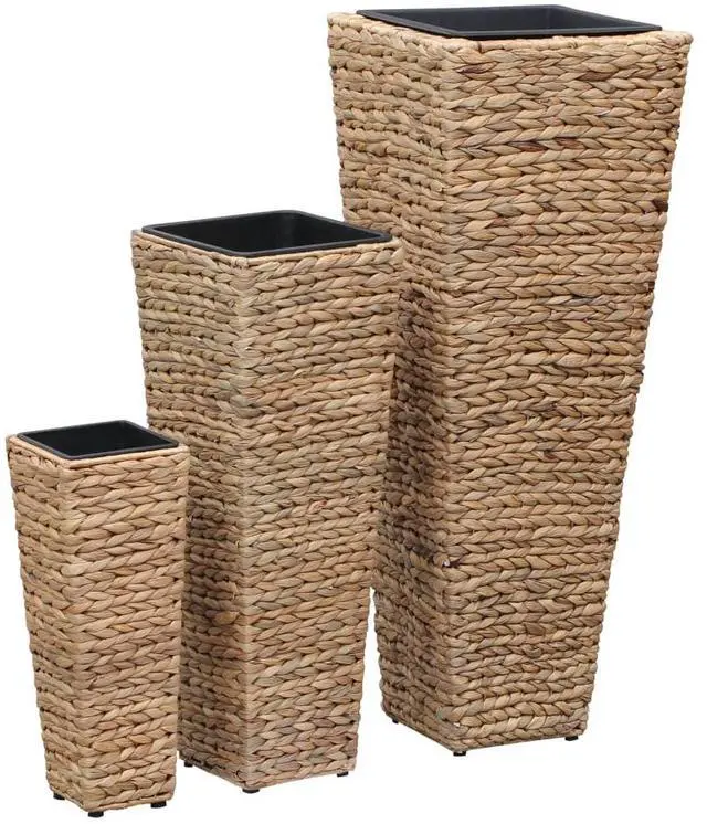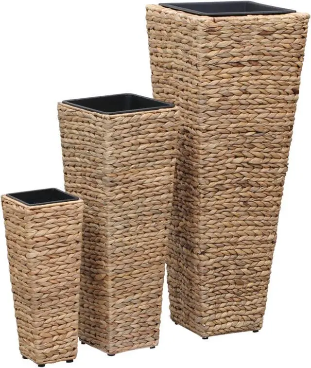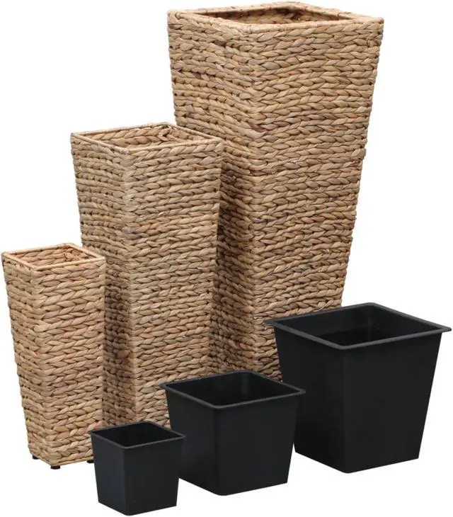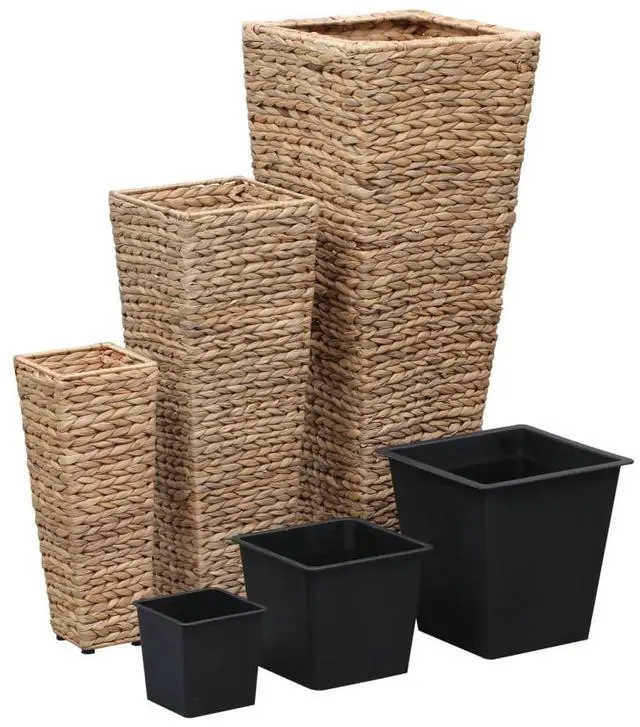 vidaXL Garden Raised Beds 3 pcs Water Hyacinth Brown - 45568, Grow and showcase flowers or plants in our rustic-style water hyacinth planter set! The 3 planters have different sizes which allow you to get creative as well as arrange them whatever you'd like! Made of water hyacinth, these planters are highly durable and easy-to-maintain. Additionally, the steel frame enhances the planters' sturdiness and stability. These patio planters are easy to clean with a damp cloth. These garden planters are equipped with removable plastic inner pots. Get ready to add a touch of verdure to your home with our beautiful planters! We recommend maintaining this planter set indoors. Delivery includes 3 planters in different sizes.