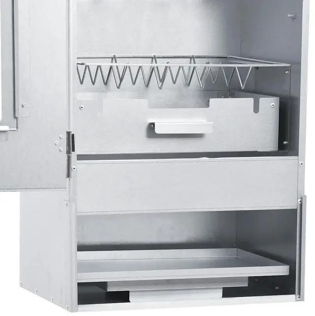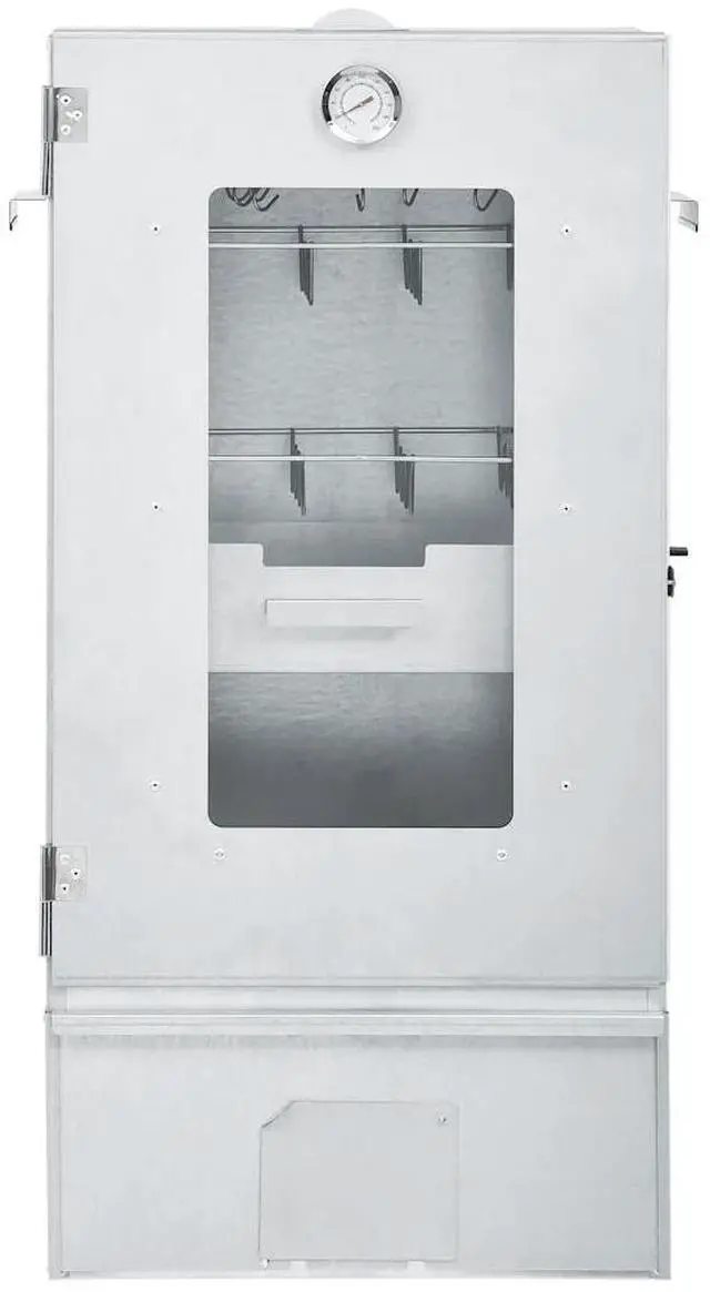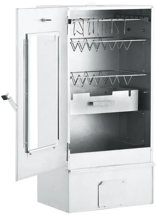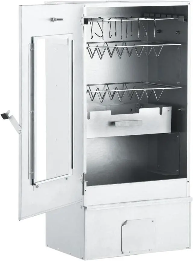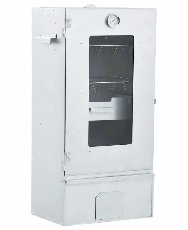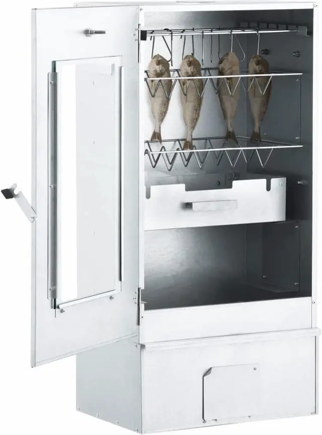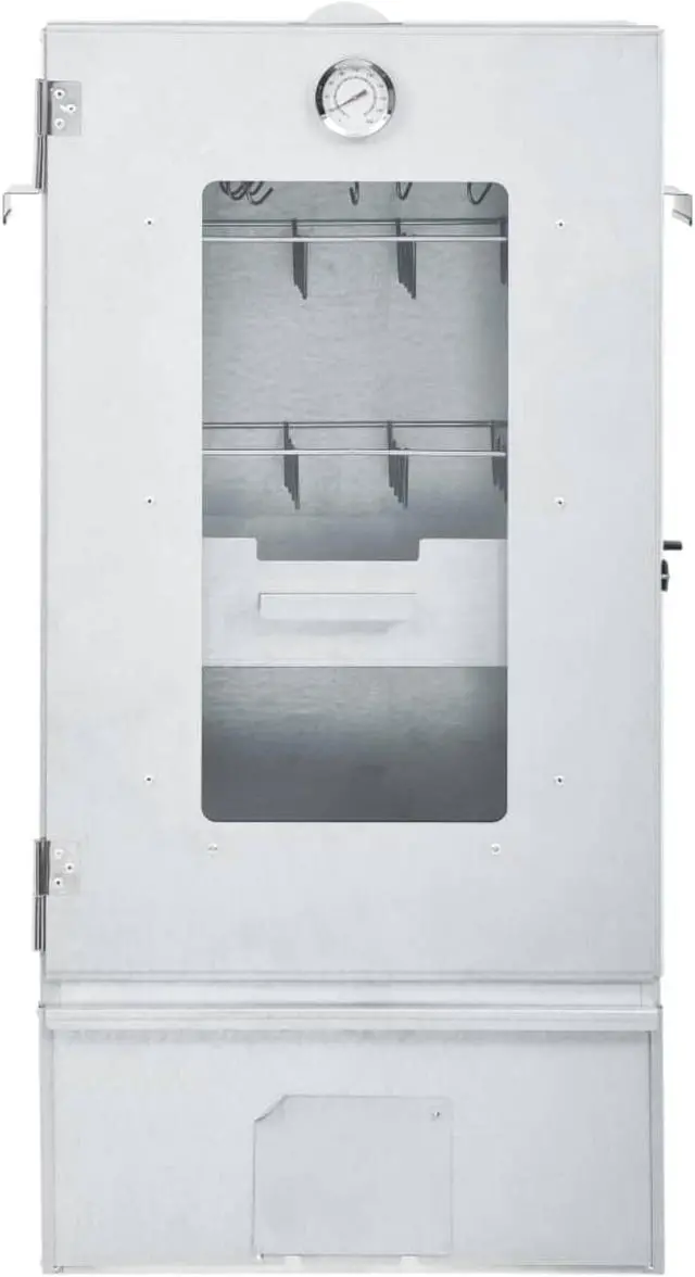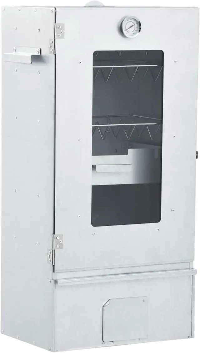 vidaXL BBQ Oven Smoker with 2.2lbs Wood Chips 17.5"x11.4"x32.7" - 46528, With this multi-functional oven smoker, you can smoke meat, fish, as well as sausages. Make a feast and enjoy outdoor get-together with your family! This smokehouse is equipped with a thermometer to keep you informed about the chamber temperature. Through the window, you can keep an eye on the food inside. The 83 cm tall smoking oven provides plenty of space for smoking the meat. The outdoor grill is made of galvanised steel and suitable for outdoor use. Thanks to the zinc plating on the rack, fire bowl and ash tray, the BBQ is rust resistant. Both the drawer and fire bowl are equipped with a handle. Additionally, 1kg wood chips and 12 S-shaped hooks are included in delivery. Do not use the barbecue in a confined and/or habitable space e.g. houses, tents, caravans, motor homes, boats. Danger of carbon monoxide poisoning fatality.