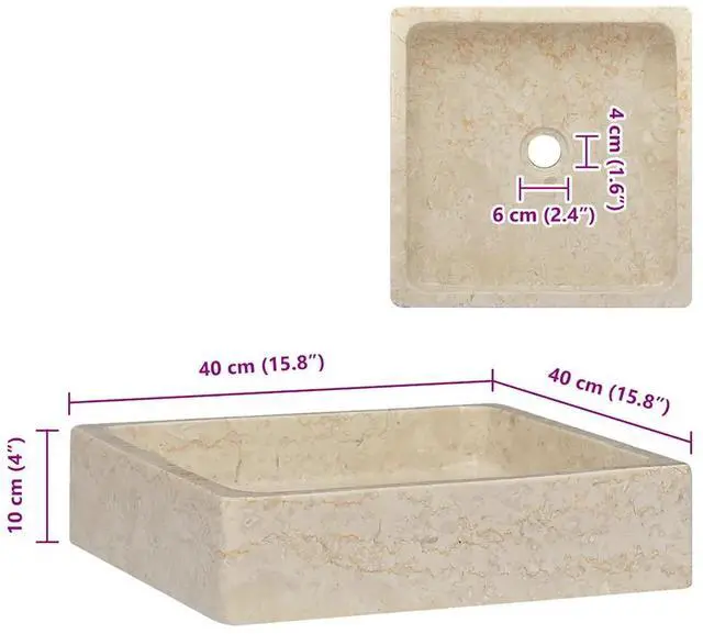 149168 vidaXL Sink Cream 15.7"x15.7"x3.9" Marble This marble sink exudes a modern charm and will be a real eye-catcher in your bathroom or washroom. This striking basin is not only a user-friendly sink for everyday use, but also an adornment for your living space. Fully handmade of graceful marble, the basin is extremely sturdy whilst with elegant look. It will definitely suit any interior style. Additionally, the wash basin is very easy to clean. Note: Marble is a natural product and color differences might therefore occur. The real product might be lighter or darker than in the photos and sometimes there might be a mix of colors in the product.