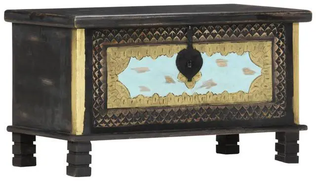 This antique-style wooden storage chest will make a unique addition to your room. It can also be used as a decorative coffee table. This trunk, with exquisite metal carving and painting in the front, is made of solid mango wood with a black finish, which makes it stable and secure to place drinks, fruit baskets or decorative items. When unlocking the box (lock is not included in delivery), you can easily store a large number of things inside. The beautiful craftsmanship and elegant wood grains make every piece of furniture distinctive and slightly different from the next. Every step of the process is carried out with the greatest care, be it polishing, painting, and lacquering. Additionally, it is easy to assemble. Important note: The colours and wood grain may vary from piece to piece, making each piece unique; the delivery is random.