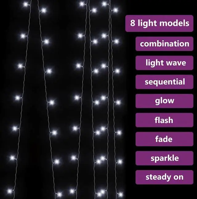 This curtain fairy light is perfect for use as a lighting addition to any decorative project. It is suitable for Christmas, parties, weddings and other holidays. The fairy light is equipped with 300 energy-saving LEDs, creating a magical lighting performance. It has 8 different lighting effects: combination mode, waves, sequential mode, slowly glowing mode, flashing, slowly fading mode, twinkling and continuous lighting. It is a great decorative accessory to illuminate indoor and outdoor spaces.