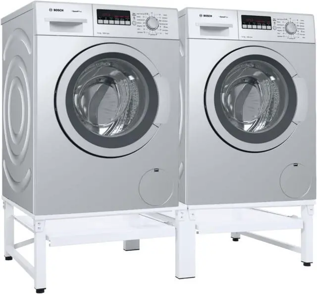 This washing and drying machine pedestal with pull-out shelves is designed to keep your washing and drying machine off the floor and raise it to a suitable working height, so you dont need to bend too much to load or remove your laundry. The washing machine pedestal stand is made of steel, making it sturdy and each can hold a weight of washing machine or drying machine up to 100 kg. Thanks to non-slip pads, the washing and drying machine stand stably. As the feet are height adjustable, the pedestal can be adjusted to compensate for uneven floors. The pedestal also has two convenient pull-out shelves for extra storage space. Additionally, it is suitable for all standard washing and drying machines.