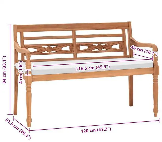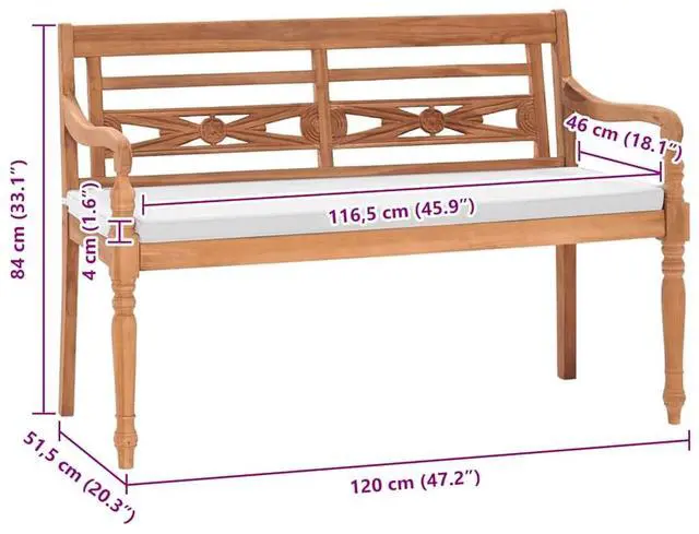 This comfortable and elegant Batavia bench will look simply stunning in the garden or on the patio. Constructed from extremely durable teak hard wood, this piece of teak furniture has been seasoned, kiln dried and then fine sanded to give a very smooth appearance. Teak wood is known for its exceptional strength and weather resistance, making it far more suitable for garden furniture than any other kind of wood. Teak wood is the perfect choice if you want to purchase a long lasting piece of garden furniture. The bench has been given an oil finish to bring out the wood's warm color.