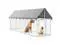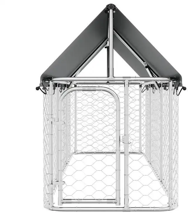 Provide safety, security and comfort for your puppy with this outdoor dog kennel. This versatile dog house features multiple uses: playing, exercising, training, or simply keeping your dog safe. It will be the perfect play paradise for your furry friends! This large dog kennel provides ample exercise space while the chain link mesh all around helps prevent mischief and unexpected accidents while enabling ventilation. Thanks to the sturdy and heavy-duty galvanized steel construction, this quality dog kennel is durable and built to last. Made of 100% polyethylene, the included top canopy is fire-resistant and UV protected, providing protection from sun, rain, snow, as well as other weather conditions. The hinged door with lockable latch system ensures extra security and safety for your dogs.