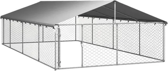 Provide safety, security and comfort for your puppy with this outdoor dog kennel. This versatile dog house features multiple uses: playing, exercising, training, or simply keeping your dog safe. It will be the perfect play paradise for your furry friends! This large dog kennel provides ample exercise space while the chain link mesh all around helps prevent mischief and unexpected accidents while enabling ventilation. Thanks to the sturdy and heavy-duty galvanized steel construction, this quality dog kennel is durable and built to last. Made of 100% polyethylene, the included top canopy is fire-resistant and UV protected, providing protection from sun, rain, snow, as well as other weather conditions. The hinged door with lockable latch system ensures extra security and safety for your dogs.