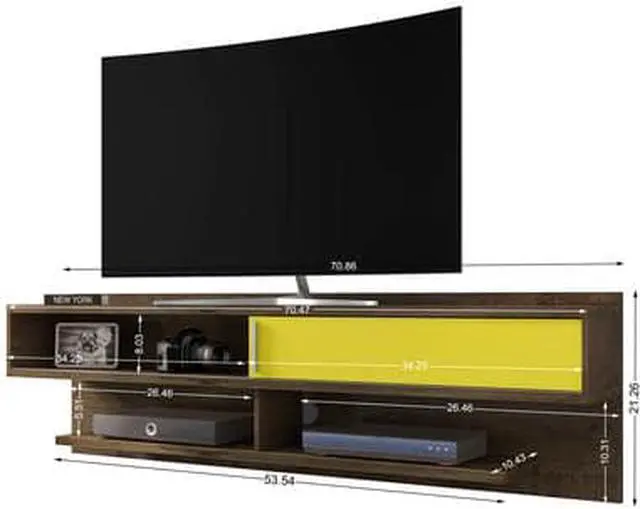 Astor 70.86 Floating Entertainment Center in Rustic Brown and Yellow - 222BMC94 The perfect gathering piece and anchor for your living space, the Astor floating entertainment center features ample space to help manage and solve all your media necessities. Remote controls, books, wires, all now stay in their place without becoming accidentally misplaced with a sliding shelf door to conceal wires or media accessories. Gaming system, DVD-player, or Blu-Ray player stay managed and organized, while your TV gets the showcase it deserves, with a base large enough to treat your guests to prime entertainment a stylish backdrop thats both seamless and functional.