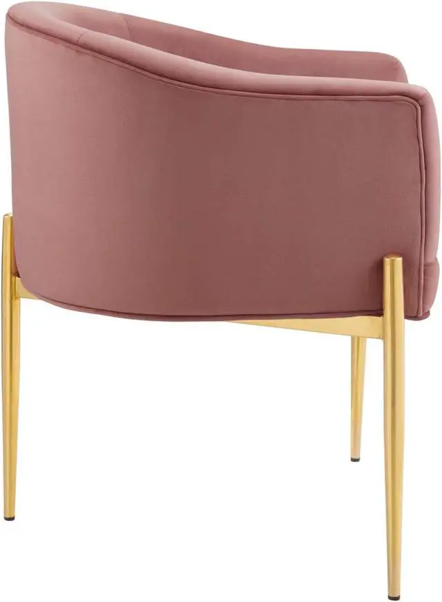 Bring luxe elegance to your living space or dining room with the Savour Tufted Performance Velvet Accent Armchair. Featuring a sweeping silhouette and updated club chair design, this velvet chair is suited for the dining table or living room, entryway, bedroom, or office as an accent chair. This accent chair is upholstered in stain-resistant performance velvet upholstery and features dense foam padding to offer a comfortable seat while dining, working, reading, or relaxing. Resting on chrome gold stainless steel legs, this versatile accent chair has interior button tufting and a charming curved shape. Chair Weight Capacity: 300 lbs.Set Includes:One - Savour Tufted Accent Chair