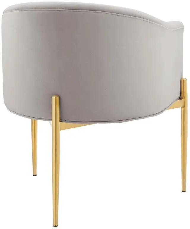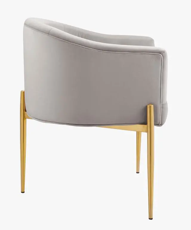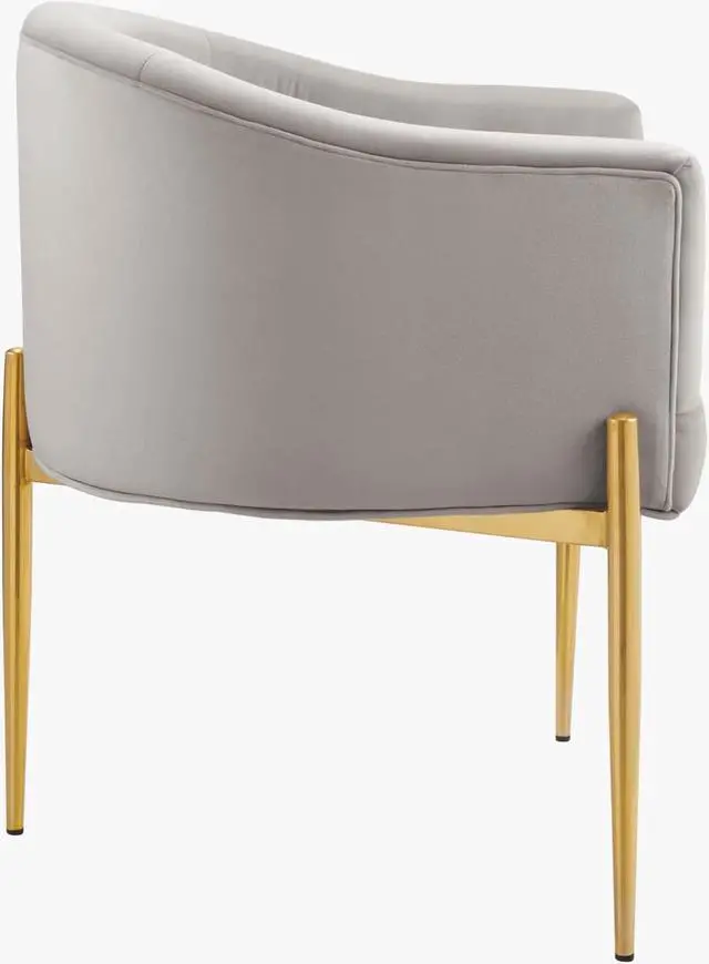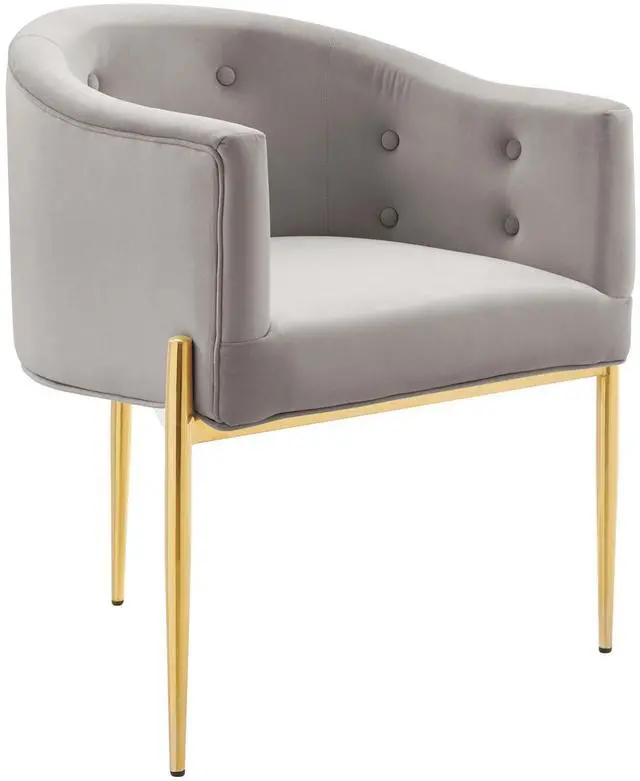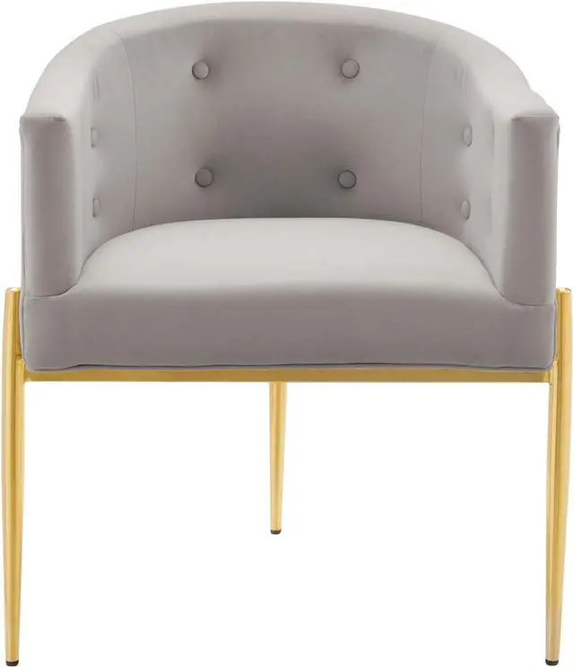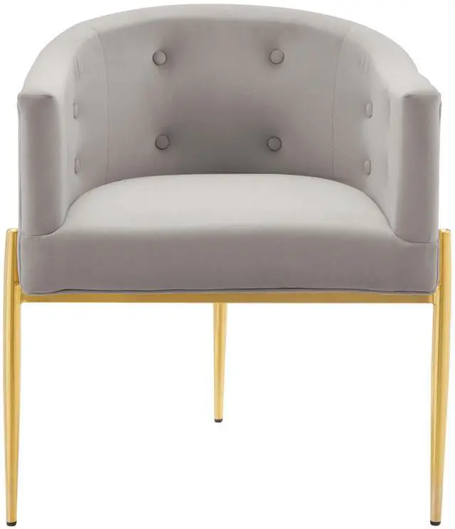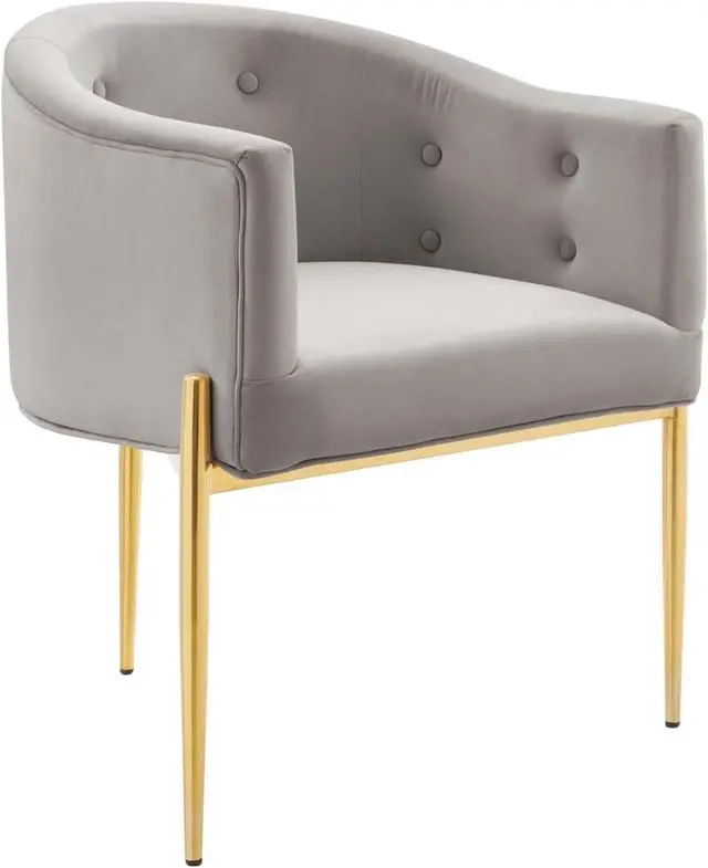 Bring luxe elegance to your living space or dining room with the Savour Tufted Performance Velvet Accent Armchair. Featuring a sweeping silhouette and updated club chair design, this velvet chair is suited for the dining table or living room, entryway, bedroom, or office as an accent chair. This accent chair is upholstered in stain-resistant performance velvet upholstery and features dense foam padding to offer a comfortable seat while dining, working, reading, or relaxing. Resting on chrome gold stainless steel legs, this versatile accent chair has interior button tufting and a charming curved shape. Chair Weight Capacity: 300 lbs.Set Includes:One - Savour Tufted Accent Chair